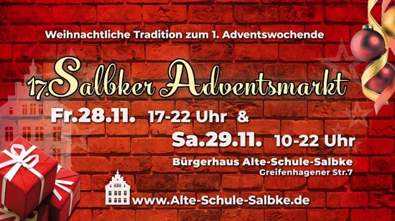 Starten Sie mit uns in die schönste Zeit des Jahres! Der Adventsmarkt in der Alten Schule Salbke öffnet seine Tore für einen stimmungsvollen Auftakt voller Musik, Tanz und Lichterglanz.