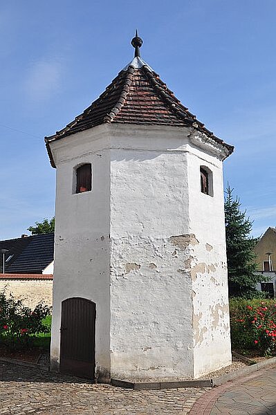 Der achteckige Turm ist aus Bruchsteinen gemauert und verputzt. Das gleichfalls achteckig gestaltete Dach ist pyramidenförmig und mit Ziegeln gedeckt. Als Turmspitze dient eine Kugel.