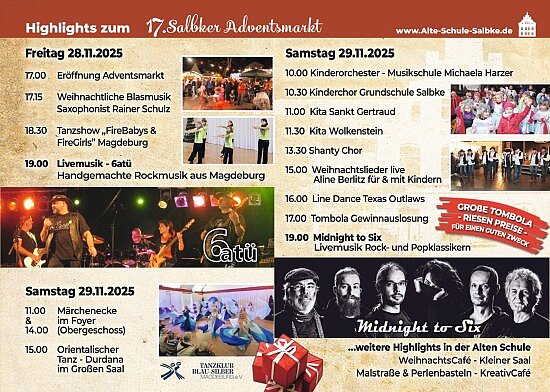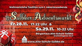Starten Sie mit uns in die schönste Zeit des Jahres! Der Adventsmarkt in der Alten Schule Salbke öffnet seine Tore für einen stimmungsvollen Auftakt voller Musik, Tanz und Lichterglanz.
