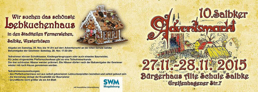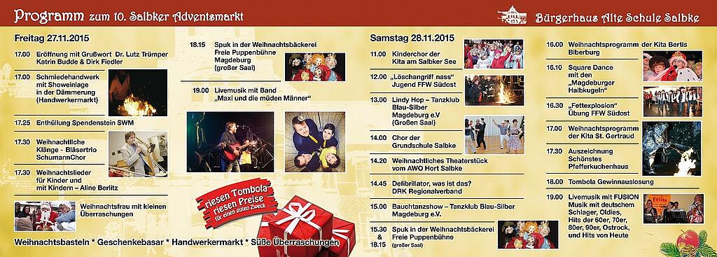 Am Samstag wird das schönste Lebkuchenhaus prämiert (Infos unter www.alte-schule-salbke.de). Auch in diesem Jahr lockt wieder eine große Tombola mit fantastischen Überraschungspreisen. Hauptpreis ist ein Kaffeevollautomat. Lose sind an beiden Tagen zu bekommen. Die spektakuläre Auslosung auf der Bühne ist am Samstag Abend.