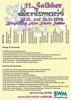 „Es wird wieder ein Fest für alle“ betont der Vorsitzende des Fördervereins „Bürgerhaus Alte Schule Salbke“ e.V., Dirk Fiedler. Er meint damit zwei Tage Adventsmarkt an und in der Alten Schule Salbke, am 25. und 26. November, wie gewohnt zum Start in das erste Adventswochenende. Bereits zum 11. Mal hat der Förderverein über Wochen und Monate die Planung und Organisation von Programm und vielen Leckereien geschafft und erwartet schon zur Eröffnung am 25. November um 17 Uhr einen gut gefüllten Schulhof.