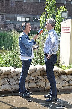 Am Vormittag besichtigte der Leiter des Krisenstabes, Holger Platz, das Areal und überzeugte sich persönlich von der Lage vor Ort. Sehr vorbildlich und sympathisch! Er stellte sich interessiert den Fragen der Anwohner und gab bereitwillig Auskunft, ebenso einem zufällig anwesendem Reporterteam vom Deutschlandfunk, welches zuvor Anwohnermeinungen zu erkunden versuchte.