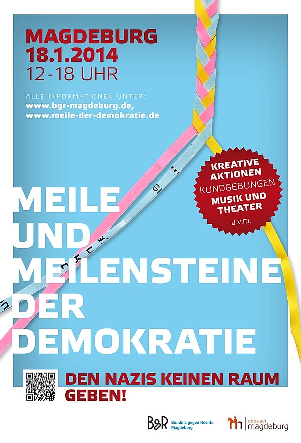 Gemeinsam rufen das Bündnis gegen Rechts und die Stadt Magdeburg zur Teilnahme an den vielfältigen Protesten auf: Magdeburg gehört auch am 18. Januar 2014 den engagierten Demokratinnen und Demokraten. Lassen Sie uns den Nazis gewaltfrei mit Zivilcourage und Entschlossenheit entgegentreten! Wir wollen keine Nazi-Aufmärsche in unserer Stadt!