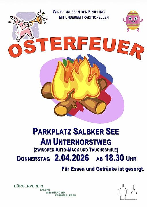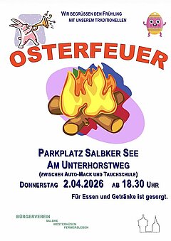 Das traditionelle Salbker Osterfeuer des Bürgervereins Salbke, Westerhüsen, Fermersleben in diesem Jahr am Gründonnerstag, den 2. April 2026, ab 18.30 Uhr, auf dem Parkplatz am Salbker See (zwischen Auto-Mack und Tauchschule), statt.