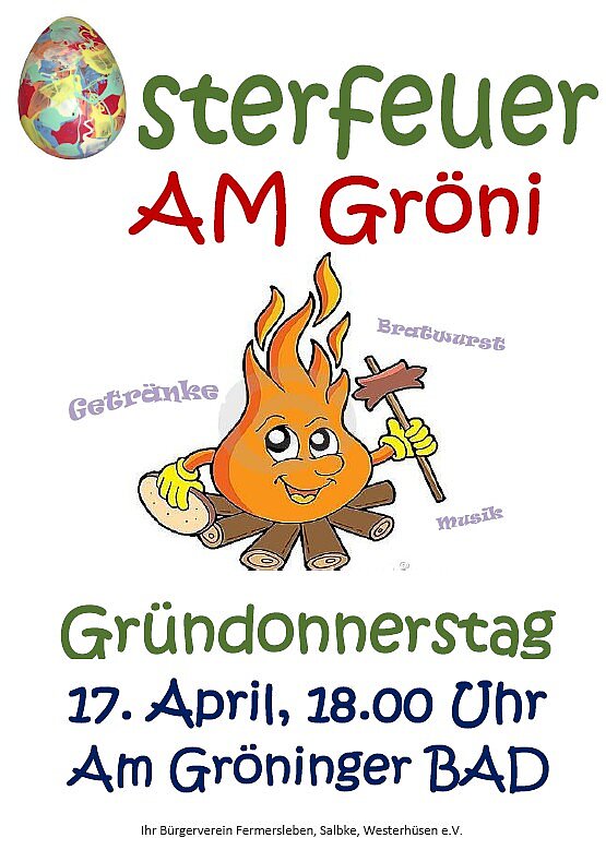 Das traditionelle Salbker Osterfeuer des Bürgervereins Salbke, Westerhüsen, Fermersleben findet auch in diesem Jahr am Gründonnerstag, den 17. April 2014, ab 18.00 Uhr, auf der Fläche am Gröninger Bad, Gröninger Straße, statt.