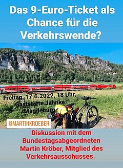 Dazu veranstaltet der Fahrgastverband Magdeburg am Freitag, 17.6.2022 um 18 Uhr in der Gaststätte Jahnke in Magdeburg-Fermersleben einen Diskussionsabend mit dem Bundestagsabgeordneten Martin Kröber, Mitglied des Verkehrsausschusses.