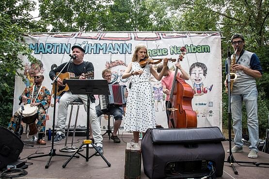 14.45 Uhr wir Martin Rühmann mit neuen Nachbarn auftreten. „Das fliegende, kunterbunte Karussell“, ein musikalisches Mitmachprogramm für Kinder und die ganze Familie mit Liedern von Martin Rühmann, G. Schöne u.a. Ein Karussell direkt aus Paris hat sich vorgenommen einmal um die Welt zu den Kindern zu fliegen.